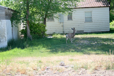 Around ten in the morning the wife and I were working in the backyard in the garden. I happened to look over the fence into the neighbor's back yard, and to my surprise I spotted this cautious little mule deer doe. She looked back at me and then continued browsing on the grass. I ran in the house and grabbed my camera and began shooting. She glanced at me occasionally, but seemed more concerned about eating. I assume that after a few seconds she grew nervous at the sound of the camera and decided to move on to greener pastures.